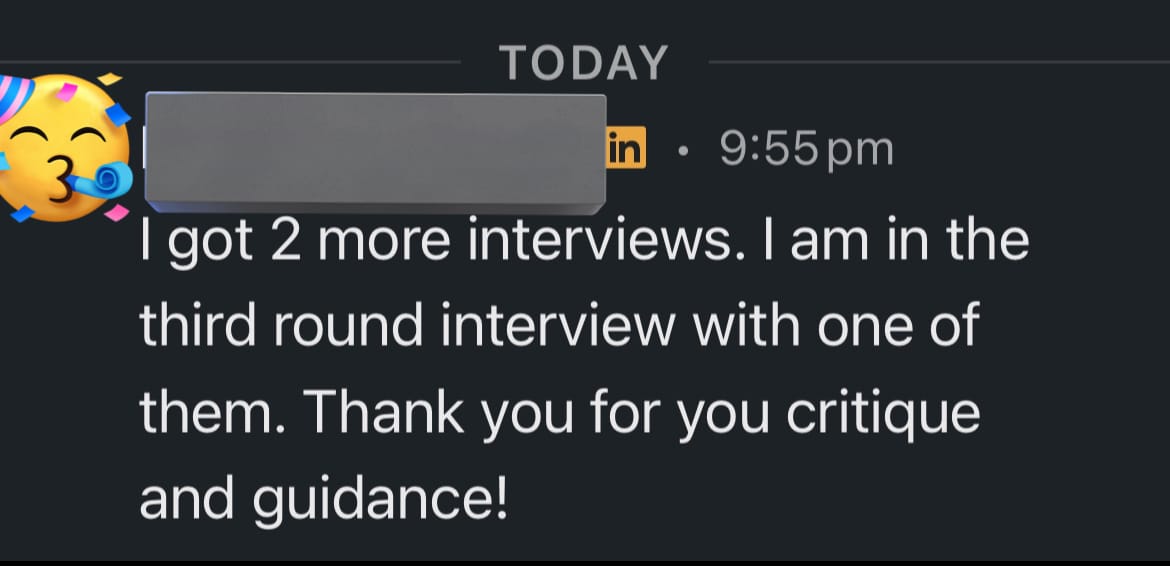 After making those changes, the results followed pretty quickly. Multiple interviews, progressing into later rounds, and a noticeable increase in momentum and confidence in the search.